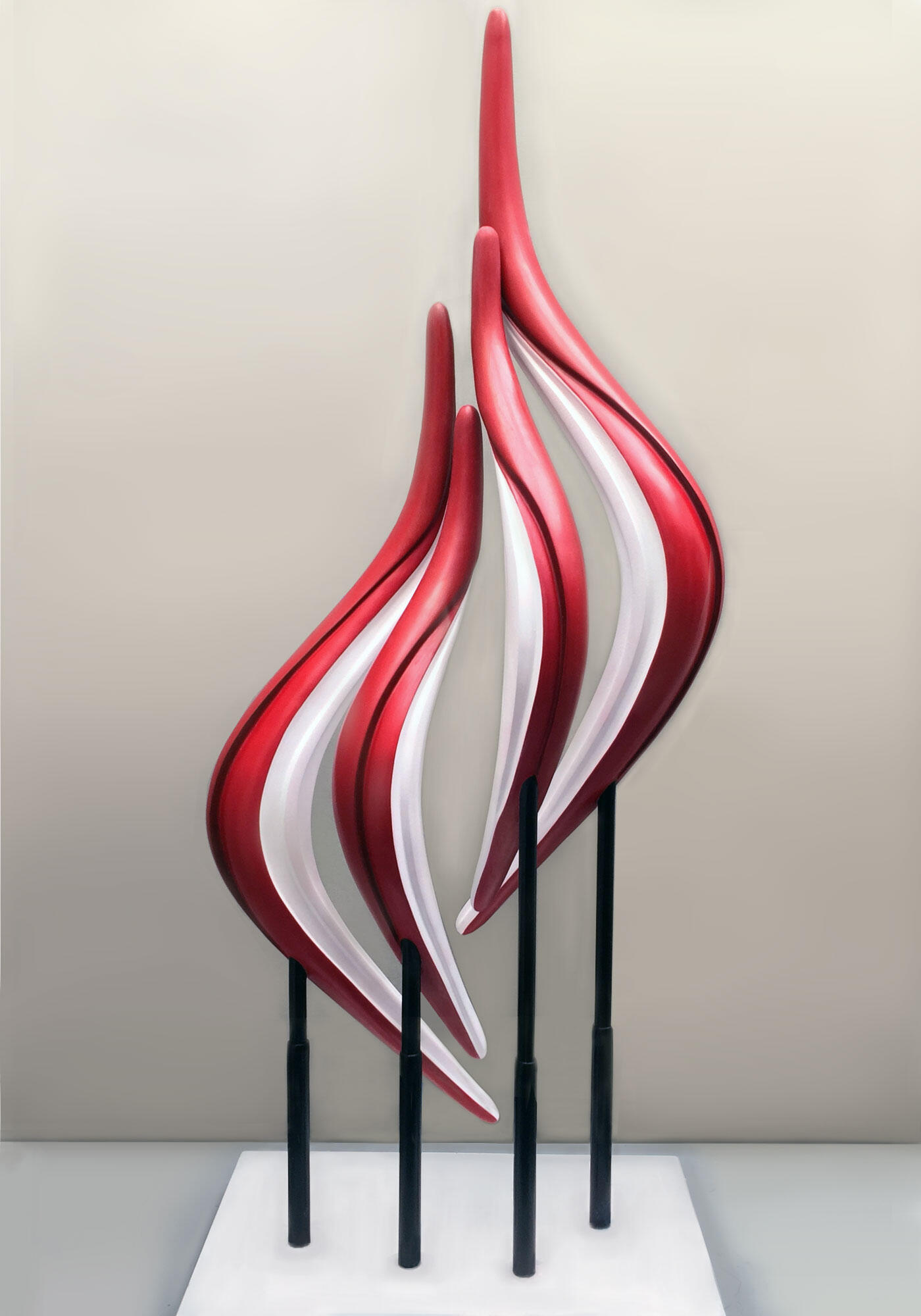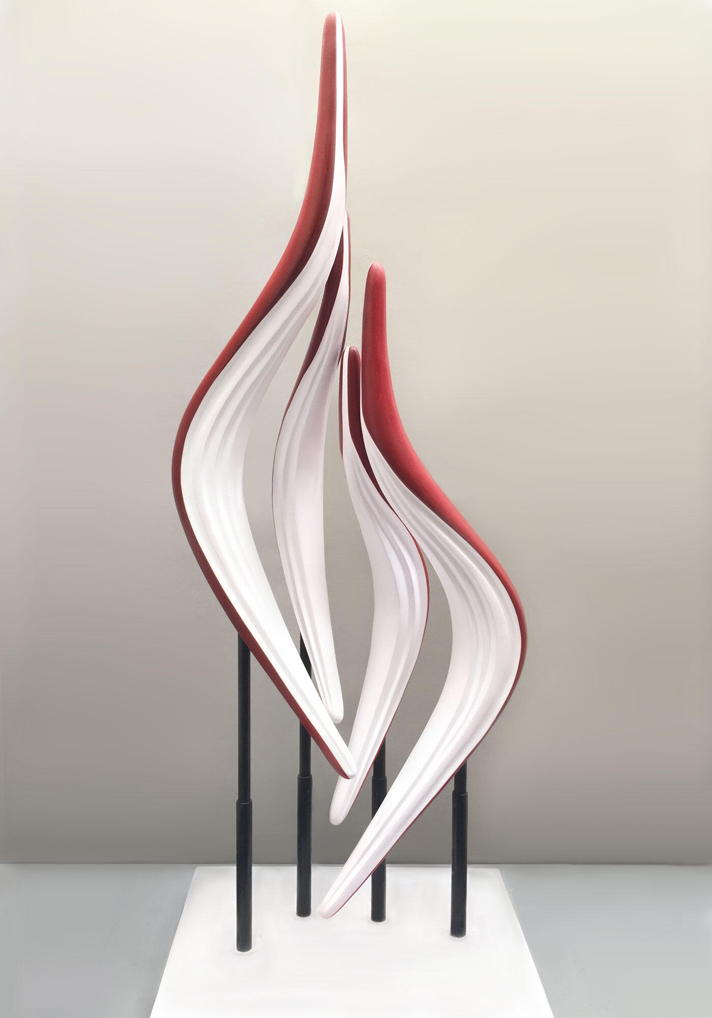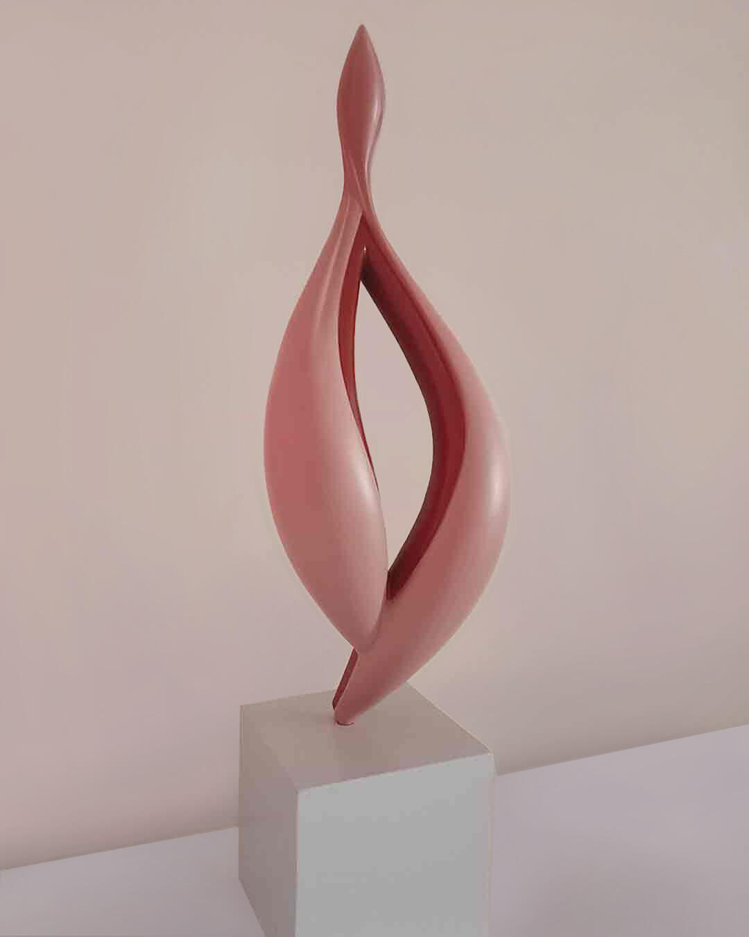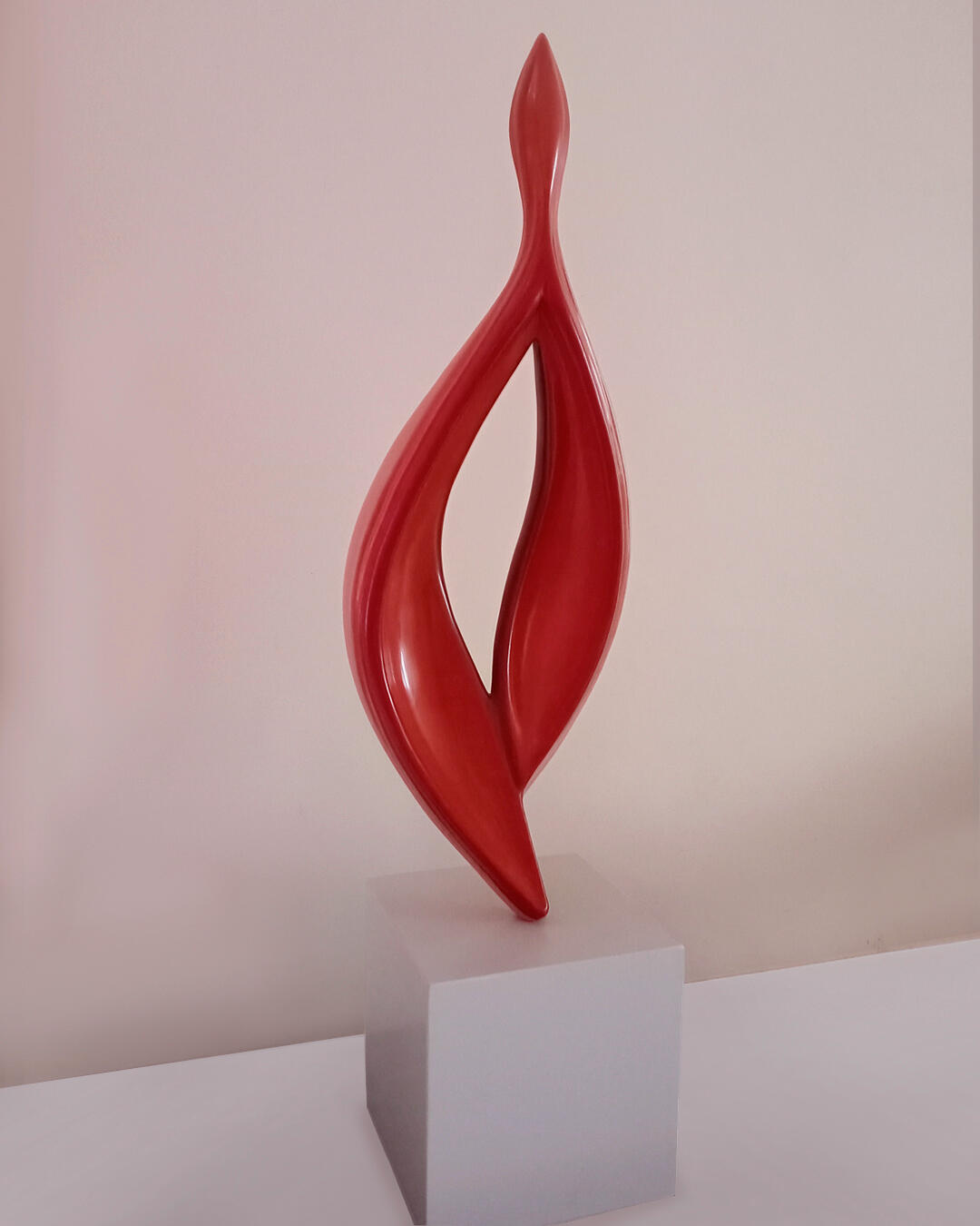 ES↓ Beautiful Eva departs from a formal equilibrium built by four curved bodies that, upon uniting, form a single presence. The geometric exploration leads toward a feminine essence that integrates masculine and feminine energy in one gesture, dissolving boundaries and hierarchies.Named "Eva," the work enters into dialogue with biblical imagery in order to reimagine it. Traditionally associated with "original sin" and exile, this Eva embodies neither guilt nor condemnation. The exterior red, an evocation of the forbidden fruit, is reframed as a symbol of knowledge and consciousness. The ascending forms — which may suggest serpent, uterus, and vertical impulse — no longer announce a fall, but an awakening.