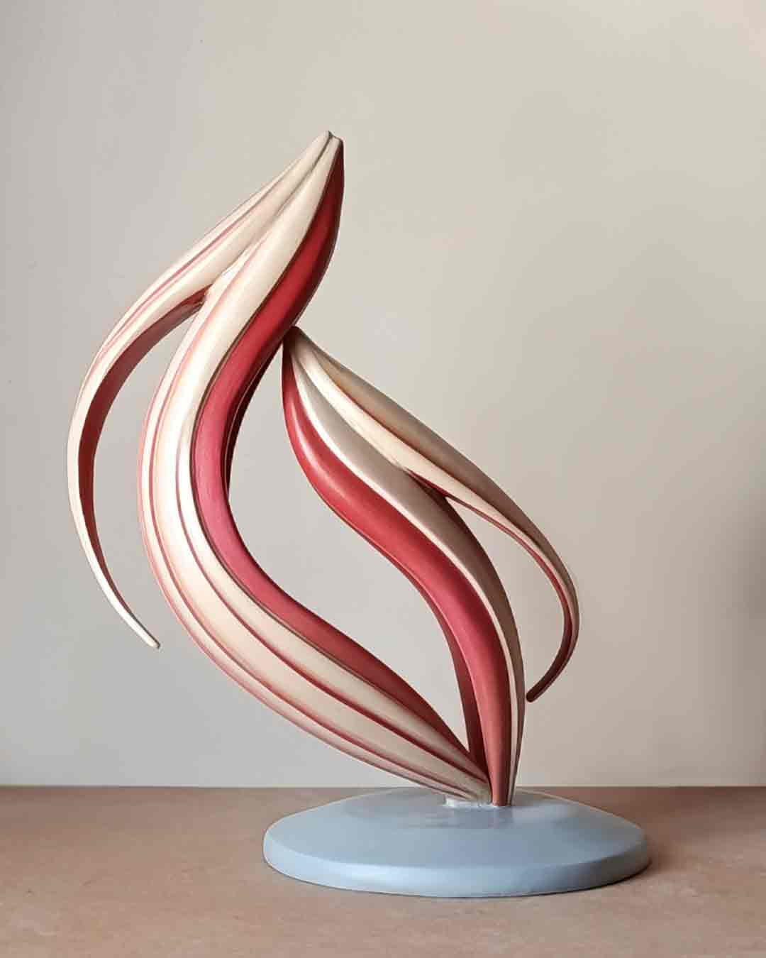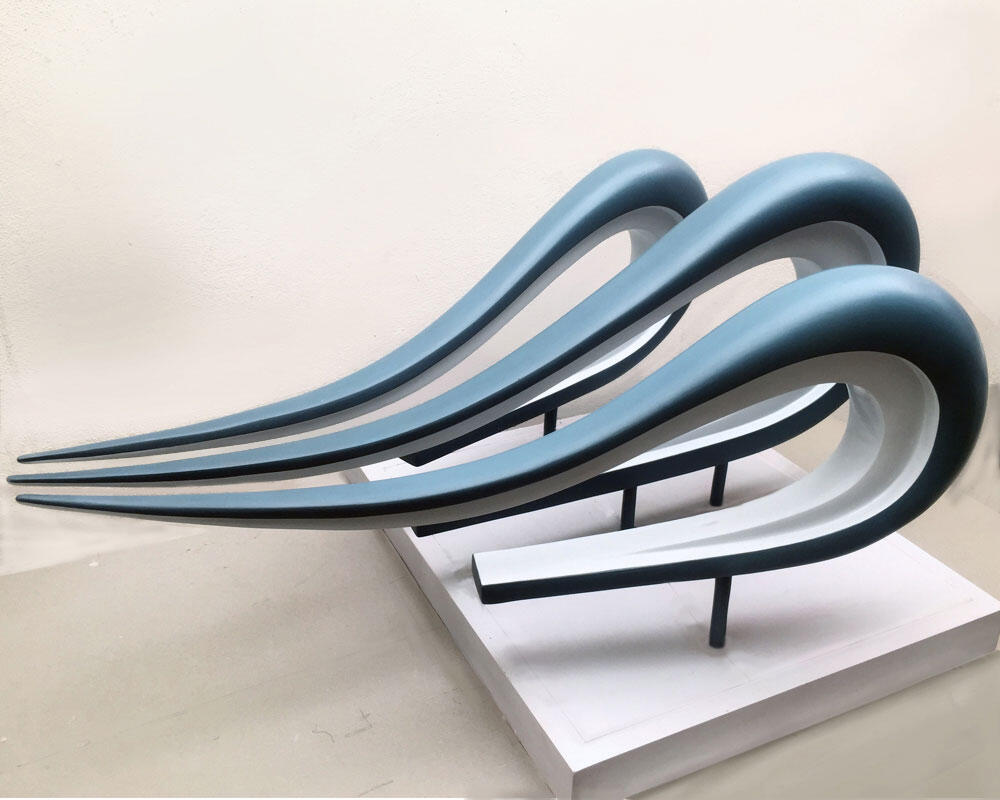 EN↓ The Surrender was conceived before the pandemic but materialized during it as the artist's first piece in resin. Its completion coincided with a period of loss and transformation, revealing the timeless character of certain forms that seem to await the precise moment to embody their meaning.Composed of three long, curved bodies, the sculpture evokes a suspended wave or a gesture arching backward. This apparent inclination to retreat gives rise to its name: a conscious surrender to the flow of life. Far from signifying defeat, the movement suggests trust in the invisible processes that accompany losses and closures, understood here as transition rather than ending.